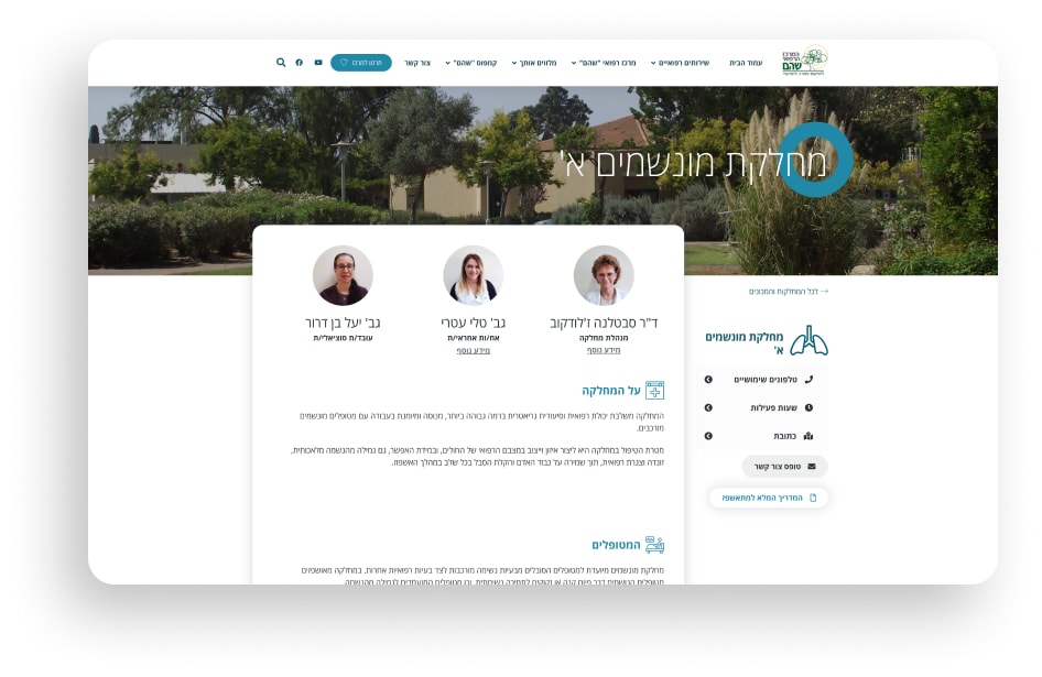 המרכז הרפואי שהם הוא מרכז ייחודי השוכן בלב עמק ירוק ומוקף בטבע, בעיצוב האתר היה לנו חשוב להעביר את תחושת השלווה והרוגע המאפיינת את המקום, לכן השתמשנו כמעט בכל עמוד בצילומי אווירה של המקום כרקע לעמודי האתר, יחד עם צבעוניות רגועה, אייקונים מונפשים ותוך שימוש בשפת המותג, יצרנו אתר נעים, נוח להבנה ולניווט, ולא פחות מכך, כלי עבודה משמעותי ואיכותי