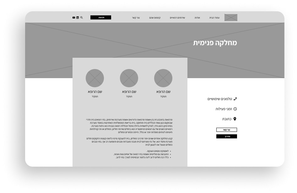 יחד עם צוות משימה מטעם המרכז הרפואי איגדנו את כל תחומי הפעילות השונים של המרכז הרפואי וחילקנו אותם ל 4 קבוצות ראשיות בהתאם לצרכי הגולשים – מענה רפואי, מידע מקצועי, מידע מנהלי, מידע למשפחות. עבור כל תחום יצרנו את הקטגוריות המתאימות. לחוויית גלישה נוחה השתמשנו ב UI (ממשק משתמש) שכולל בין היתר מגה מניו, או "סופר תפריט" שמקל על תהליך הניווט באתר, טופס הרשמה דינאמי ועוד אלמנטים רבים.